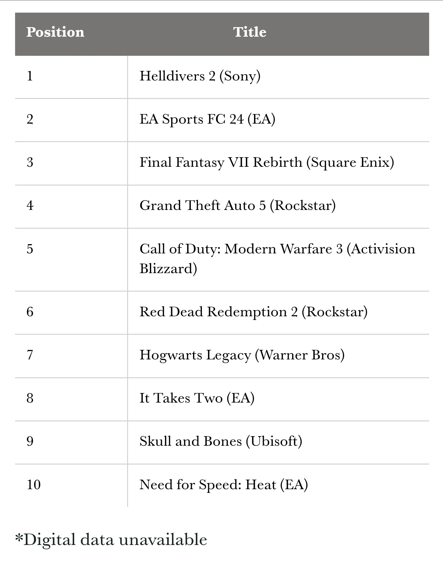 In Anbetracht dessen, dass letztes Jahr, Februar 2023, Hogwarts Legacy erschienen ist, hat sich der Monat Februar 2024 stark gehalten. Um die Stärke von Hogwarts Legacys deutlich zu machen: Die ersten fünf Wochen von Hogwarts Legacy nach Veröffentlichung waren besser als die gesamte Top 10 im Monat Februar 2024.